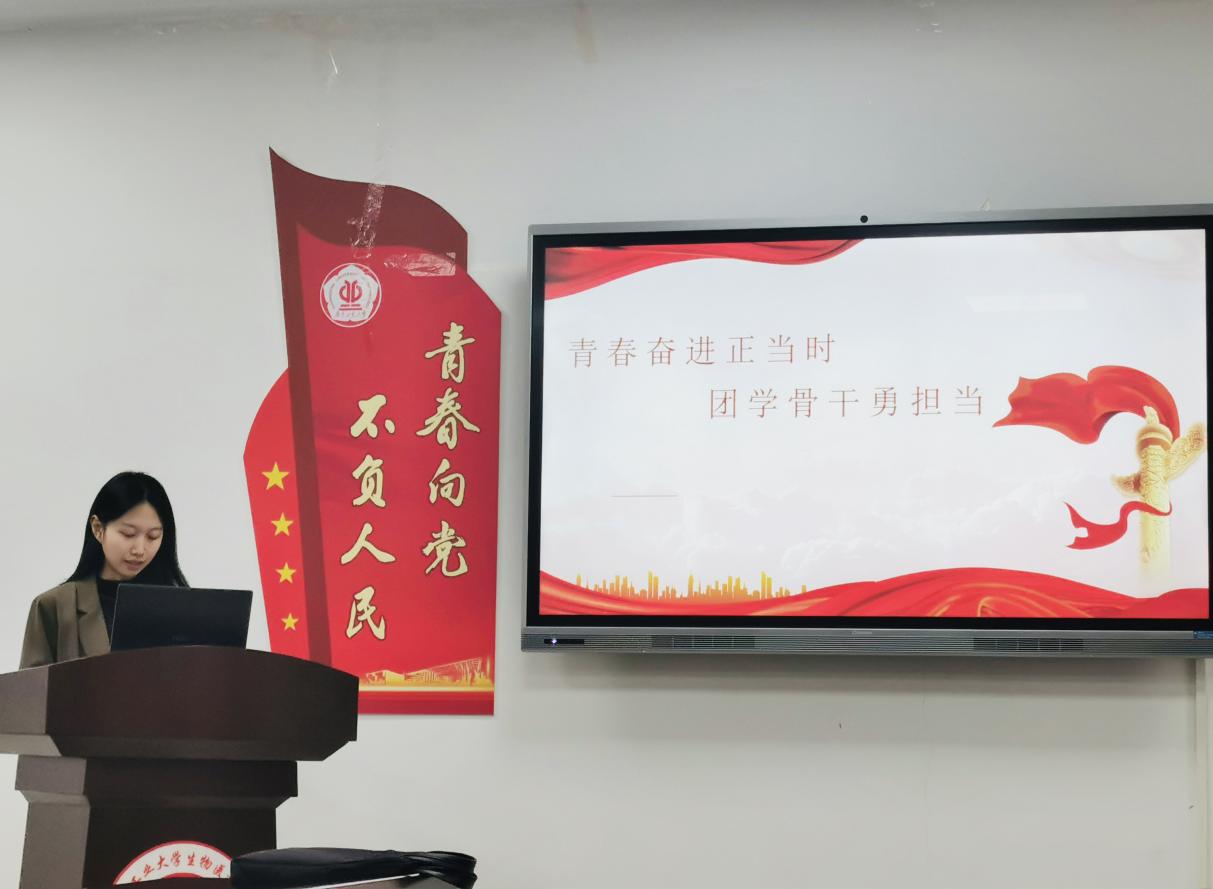 会议伊始,潘子静以《青春奋进正当时,团学骨干勇担当》为主题,从团委学生会骨干的角色定位、职责使命、沟通协调能力、团队合作意识、创新思维与实践能力,以及榜样形象塑造等多个方面进行了分享。她结合当前时政热点内容,强调了作为新时代青年学生应具备的政治素养和社会责任感,鼓励团学成员们在工作中脚踏实地,以实际行动践行服务同学的宗旨。